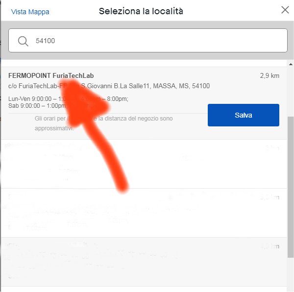 Dopo aver selezionato punto di ritiro scrivete cap e/o nostra via (San giovan battista la salle 11)